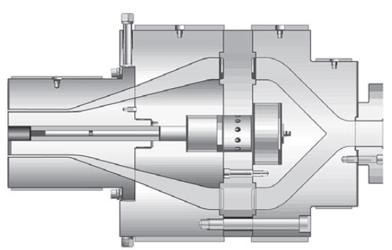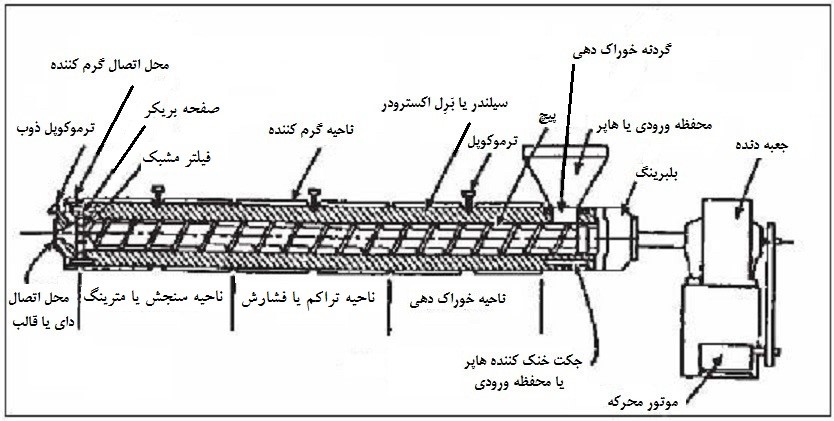 شکل ‏4 2. یک اکسترودر متداول تک مرحله‌ای و تک پیچ (رزین از سمت راست به چپ جریان می‌یابد)